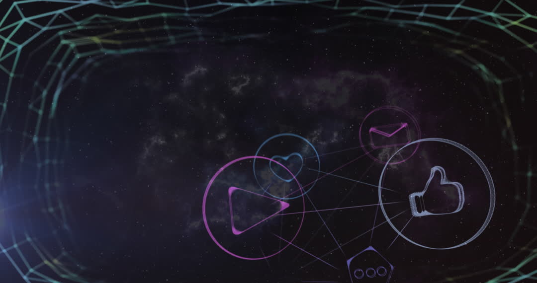Animation showing interconnected icons such as thumbs up, play, heart, and mail symbols, set against a subtle view of the globe with a network grid. This visual represents technology's role in global digital connectivity and online networking. It is ideal for use in presentations and media relating to global data processing, social media, internet services, and futuristic digital technology themes.