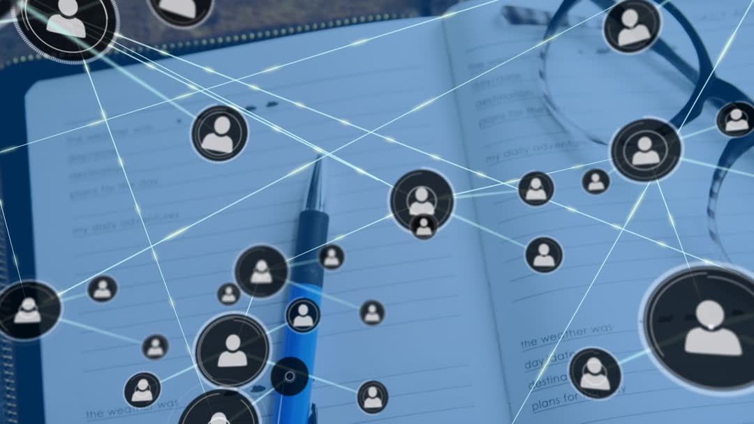 Network of digital connections featuring conceptual icons visually intertwined over a workspace scene with an open notebook and pair of glasses. Symbolizes collaboration, ongoing communication, and networking technologies. Ideal for illustrating concepts like digital transformation, communication strategies, or global networking solutions in presentations, marketing materials, or technology-related content.