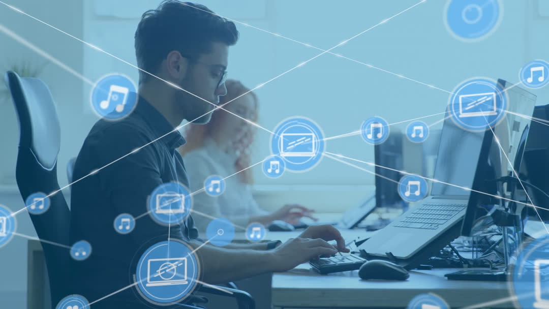 Graphic illustrates a man concentrating on his computer, enveloped by an overlay of digital network icons indicating music, messaging, and data. This visual representation serves as a metaphor for connectivity and information flow, suitable for themes exploring technology, business communication, teamwork, and the digital workspace. Useful for presentations or articles on tech in modern offices and evolving work environments.