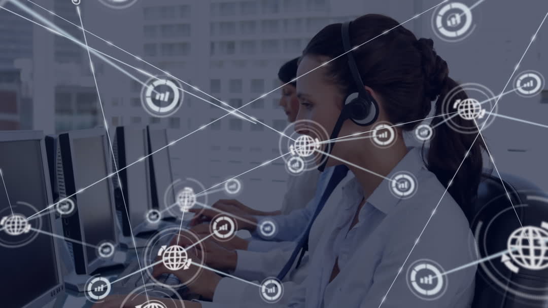 Illustrating a call center's incorporation of technology and communication networks with customer service agents using headsets. A representation of global connectedness and teamwork, the videory is suitable for business presentations, training materials, and technology marketing content emphasizing the power of networked customer care infrastructures.