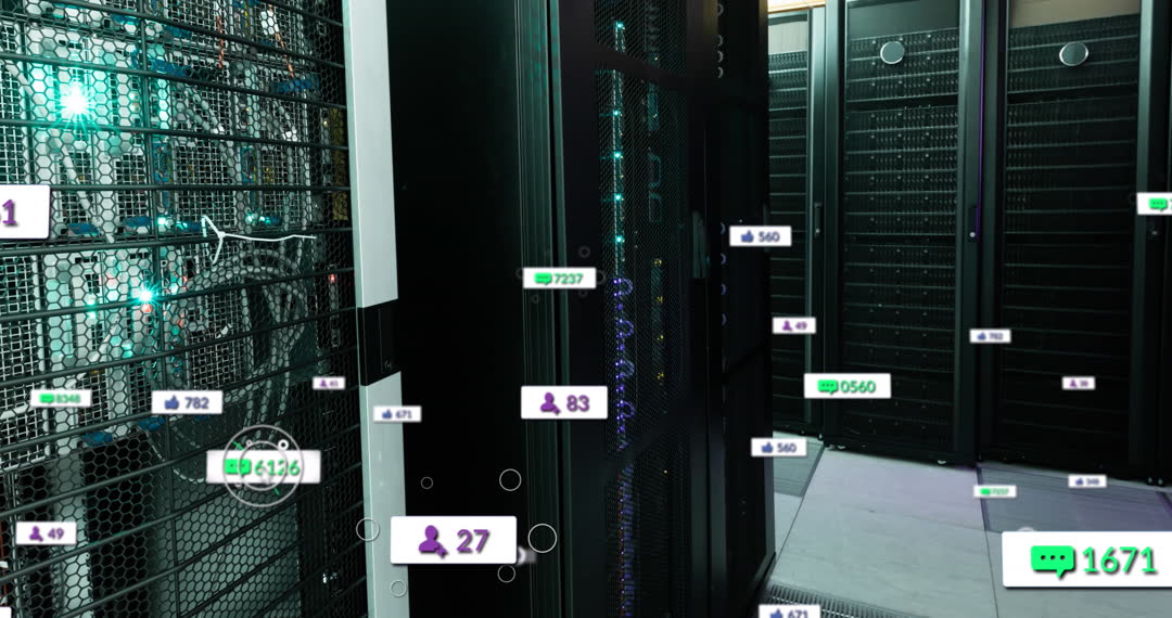 View of computer servers with overlay of social media icons indicating global communication and data exchange. Perfect for illustrating concepts like networking, social media reach, data processing technologies, or tech infrastructure in presentations, blogs, and educational materials.