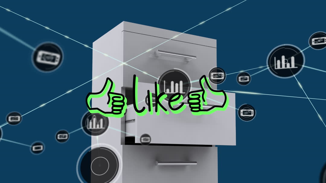 Animation shows interconnected data links over file cabinet with hand symbol for like, illustrating concepts such as secure information storage, digital networking, liking or approval mechanisms and how they integrate within business contexts.