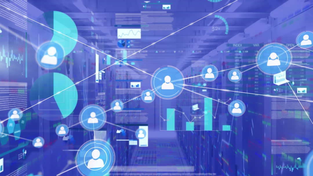 Imagery depicts a digital network overlay with icons representing connections and data analysis in a futuristic server room. Symbols suggest data flow and information transfer on a global scale. Use for illustrating concepts of modern infrastructure, cloud computing, and digital communication in business and IT presentations.