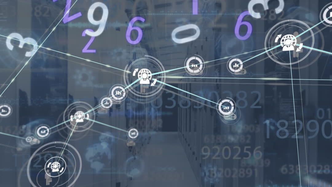 Visual representation of digital networks with icons and numbers overlaying computer servers. Useful for technology articles, data infrastructure concepts, internet and communication presentations, or emphasizing global interconnectedness and modern computing capabilities.