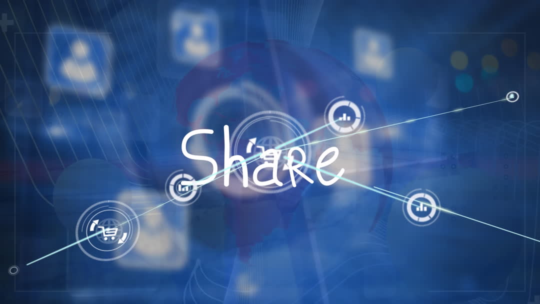 Animation of interconnected digital elements surrounding the word 'Share', symbolizing concepts such as global networking and online communication technologies. Suitable for use in presentations or projects related to business communication, social media, or digital collaboration tools. Perfect for illustrating the technological interface of online platforms.