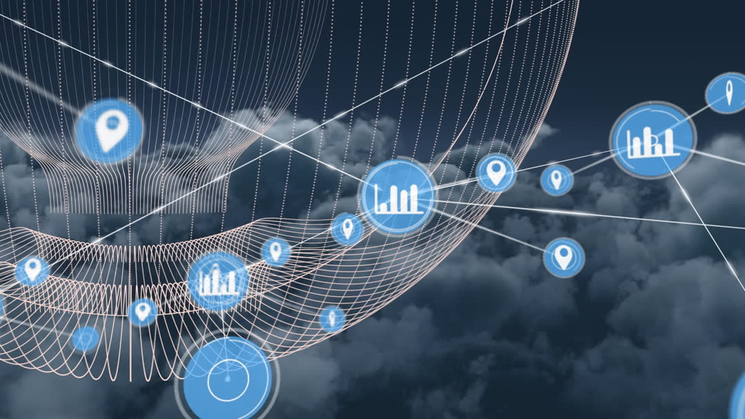 Digital network and data icons connected over a globe against a backdrop of clouds captures futuristic technology and global communication themes. Suitable for concepts related to IoT, big data analysis, and cloud computing initiatives in business presentations and marketing materials.