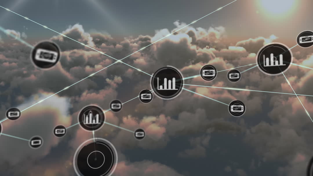 Artistic representation of a digital network overlaying a cloud-filled sky. Icons depicting connectivity and business metrics highlight technological themes. Ideal for illustrating global connectivity, business communication, and technology-focused projects. Useful for blog posts, educational presentations, or content related to digital transformation and cloud computing.