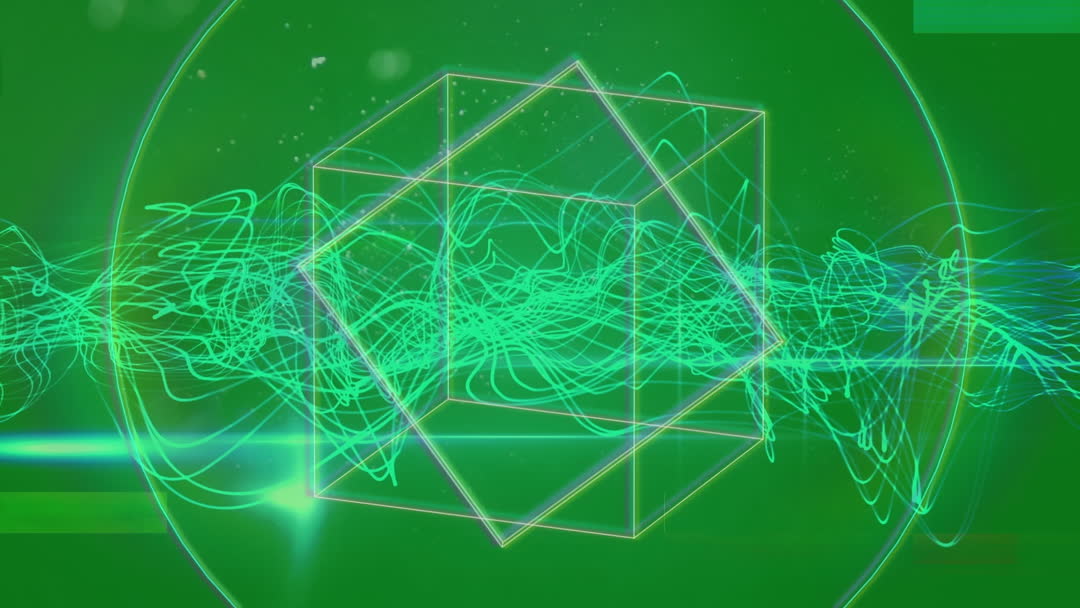 Abstract video depicting a network of digital connections overlaid on a geometric cube shape. Set against a vibrant green background, this design symbolizes technology and digital communication concept. It is ideal for use in graphics related to global business communication, digital interfaces, fintech marketing, or technology-themed presentations.