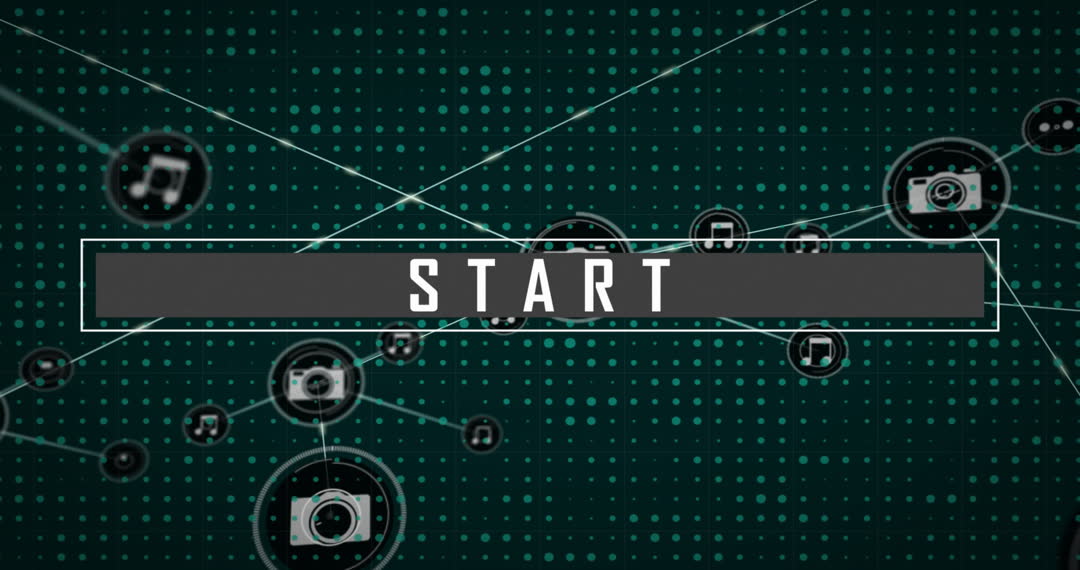 Dynamic presentation of technological start concept with digital networks and data symbols. Ideal for use in presentations about technology, innovation, or computing. Useful for illustrating topics related to networking and connectivity in a modern digital context.