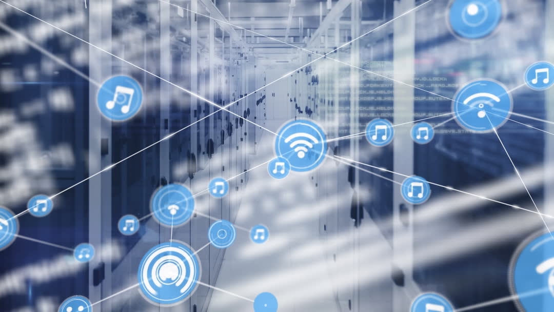 Visual represents interconnected digital networks with semi-transparent overlays of connection icons such as music download and wireless signal, all digitally rendered above a background of industrial server racks. This suggests themes of global integration, efficiency in data handling, and innovative technologies. Ideal for use in resources on data management, cloud service advertising, technology publications, and telecom services marketing, offering a futuristic depiction of interconnected systems.