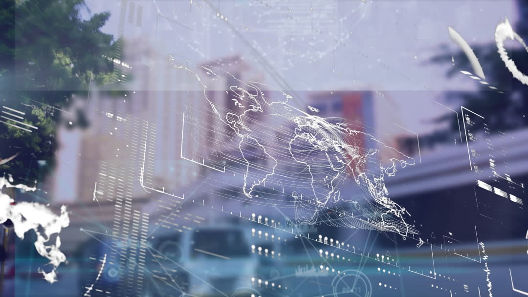 This video captures a digital visualization of a network interface with elements and connections overlaid on an urban and business environment, suggesting modern technology's influence on connectivity and global communications. Suitable for business, technology, and communications-related projects, this video represents futuristic design, global markets, and digital transformation.