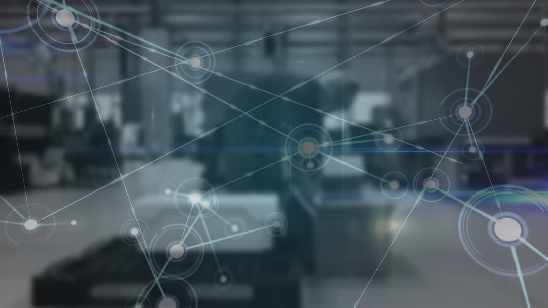 Digital Network Connections Overlay on Blurred Warehouse Background Video