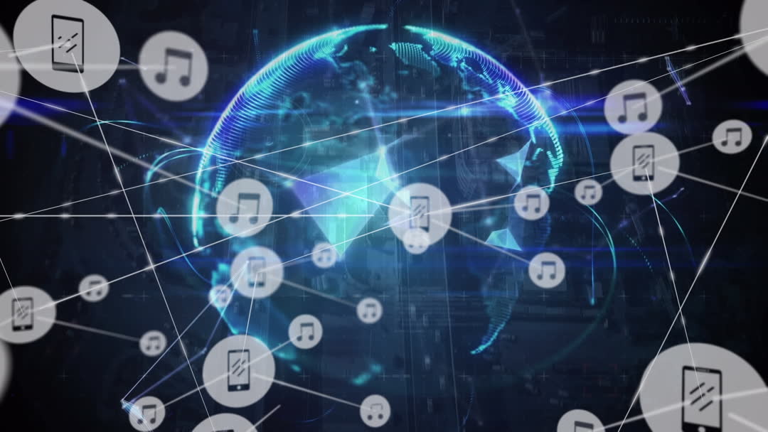 A vibrant digital network depiction showcasing interconnected icons and a geometric shape overlaying a glowing globe and cityscape backdrop. Ideal for themes of advanced technology, global communication, and digital transformation.