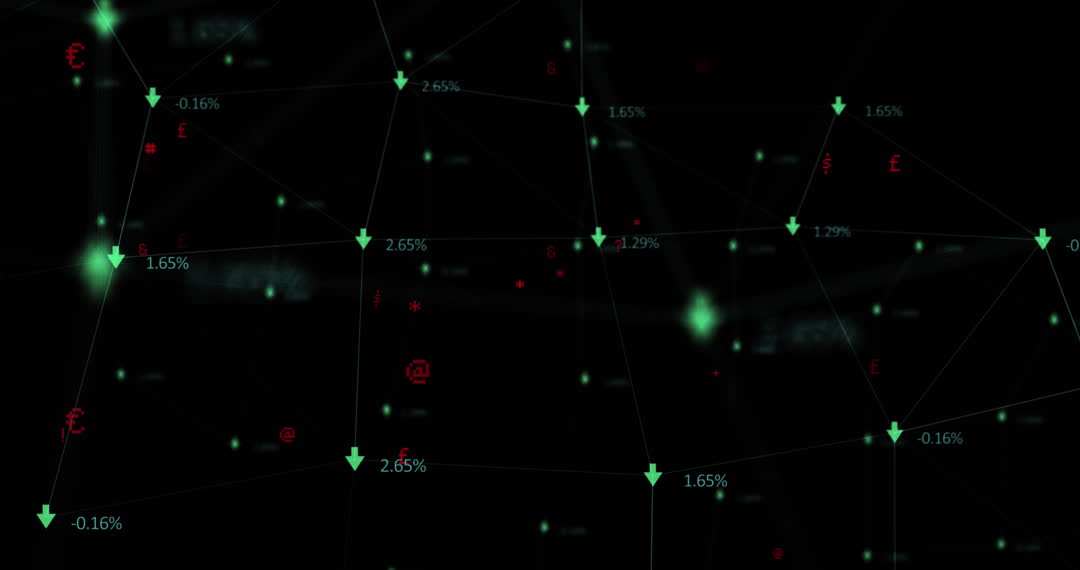 Abstract representation of a digital network with currency symbols and percentage data over a dark background. Green arrows and node points are connected to showcase connectivity and data flow. Ideal for illustrating concepts related to global finance, fintech solutions, data analysis, cryptocurrency trends, and virtual trading environments. Useful in presentations, websites, and publications focusing on digital financial technologies and data visualization.