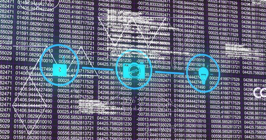 Illustration displays interconnected icons representing global data transmission and communication over a background of binary data on a purple backdrop. This visualization emphasizes technological connectivity, making it suitable for use in presentations about network infrastructure, digital security, or data processing systems.
