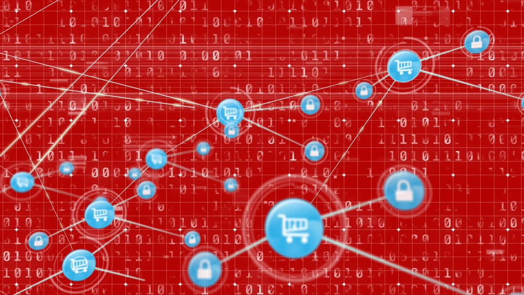 Depicting a theme of digital connectivity and cybersecurity, featuring interconnected shopping cart and lock icons set against binary code. Useful for illustrating concepts in online shopping, cybersecurity, and technology networking. Ideal for use in presentations or promotional materials related to internet commerce and data security.