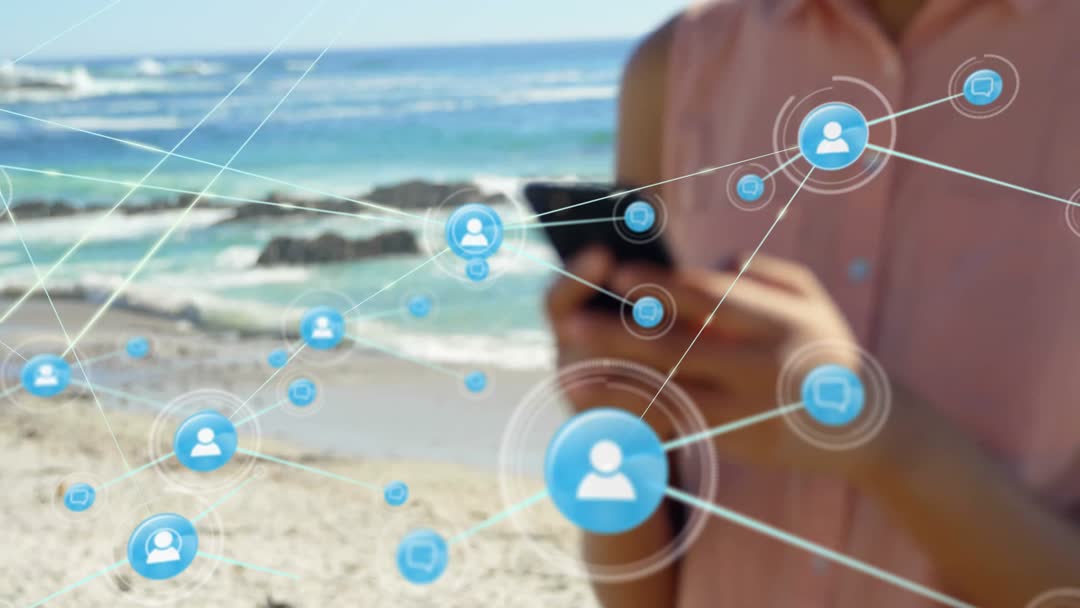 A dynamic video showing a digital network of user icons and communication nodes emanating from a smartphone, set against a sandy beach background suggesting a blend of technology and leisure. Ideal for illustrating modern communication, depicting the intersection of digital life and relaxation, or promoting tech mobile service offerings in casual, outdoor settings.