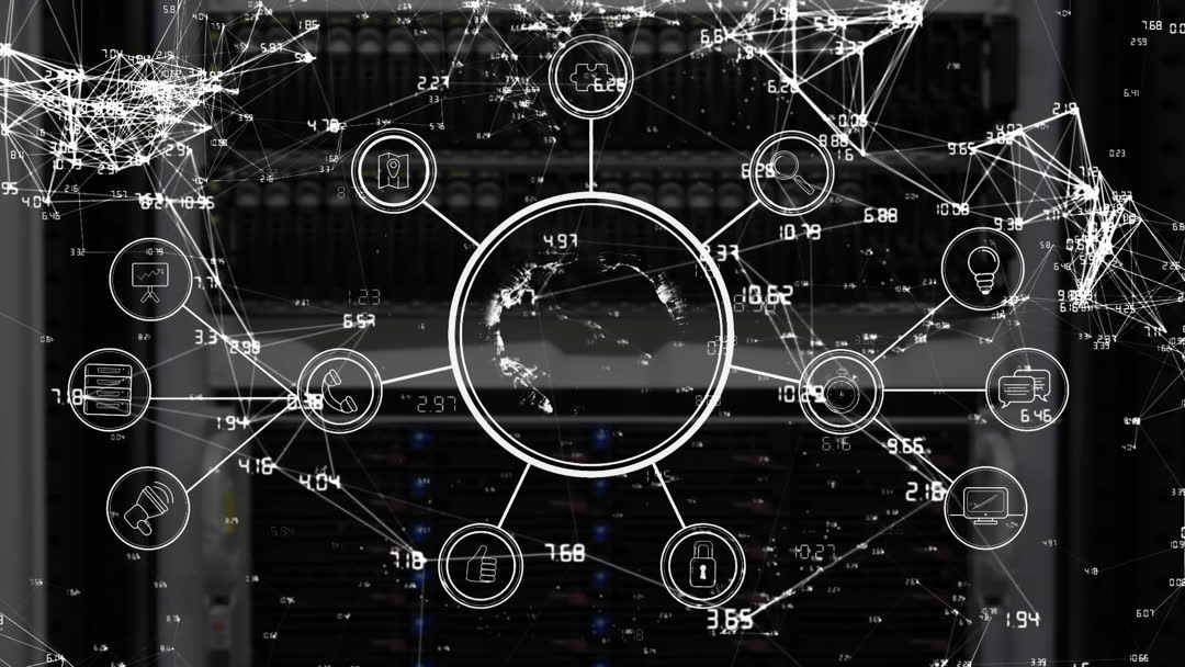 Visual representation of digital network connectivity in a data center with servers in the background and interconnected icons symbolizing various digital functions. Ideal use for technology blogs, cybersecurity posts, IT service representation, or educational resources about digital connectivity and data processing.