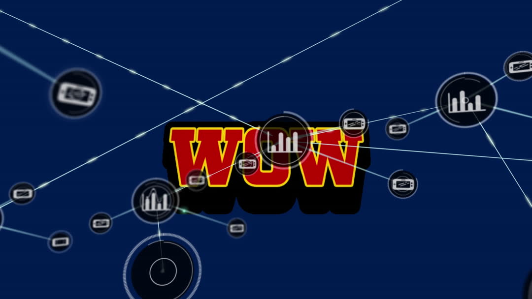 Visual depicting interconnected multimedia icons linked through a stylized network, overlaid on a striking 'WOW' text. Represents digital connectivity and data flow across global networks. Suitable for illustrating concepts in technological communication, innovative business strategies, data analysis, and futuristic multimedia solutions.