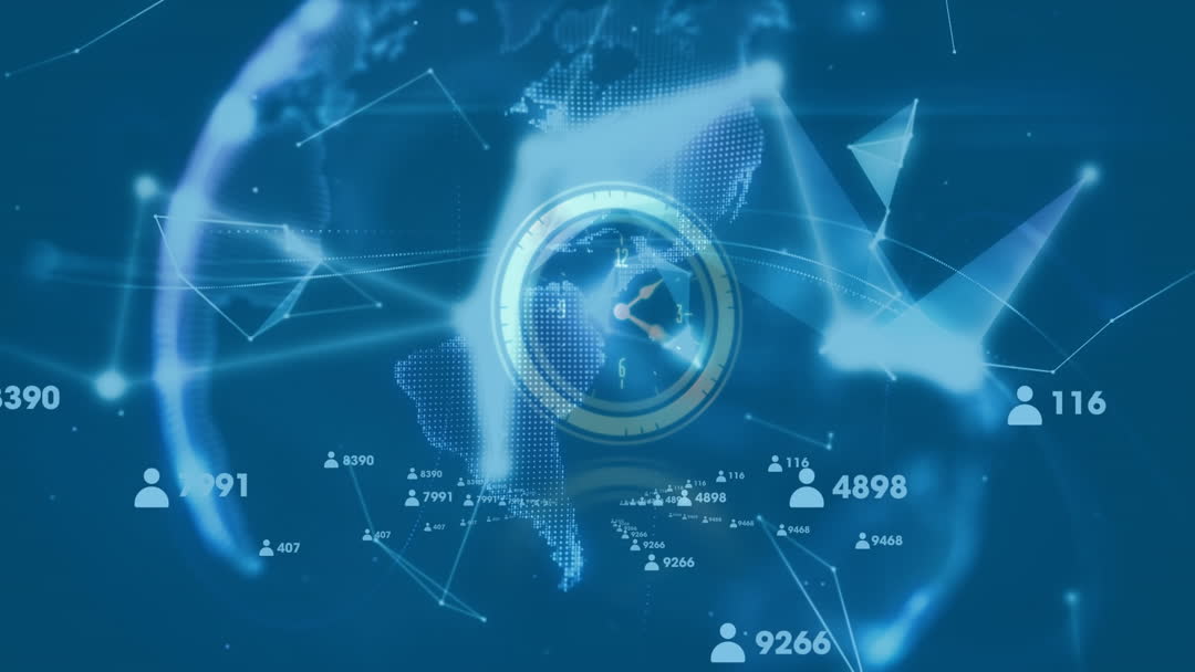 Digitally inspired composition showing abstract globe with data connections and digital clock overlay, symbolizing the interconnectedness of the modern world and the presence of social media interactions globally. It is ideal for use in presentations, articles, and digital media emphasizing advancements in technology, communication networks, and virtual reality platforms.