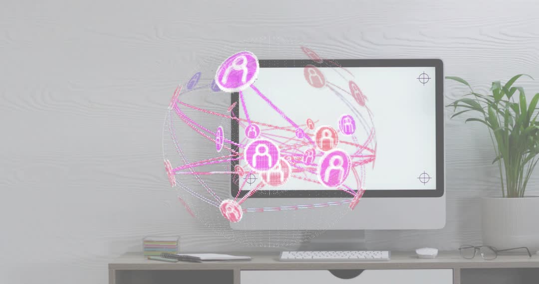 Visual demonstrates a conceptual translucent globe face, highlighting user connections on office monitor background. Captures essence of digital technology and collaborative network growth, making it ideal for business, tech innovation, or networking presentation use.