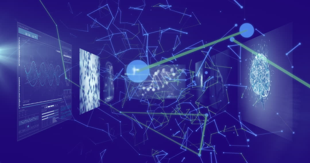 Animation depicts an evolving digital network and data connections on a blue background, with dynamic elements showcasing global data processing and technology interface. Ideal for illustrating concepts in technological growth, digital sharing, or data transmission environments. Use in presentations on IT advancements, digital evolution, or informatics.