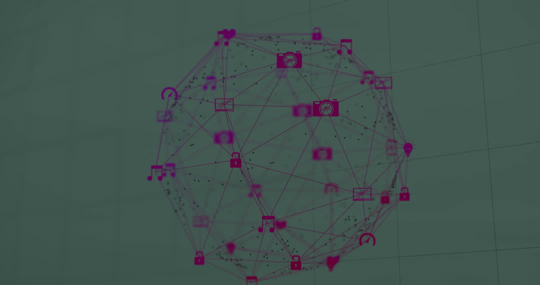 This depiction of digital network icons forming a spinning globe against a grid background represents global connectivity and technological integration. Ideal for illustrating concepts related to the internet, digital communication, or data networks, this video can enhance presentations, marketing materials, or tech-focused content.