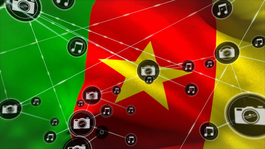 Image shows various multimedia and network icons overlaid with Cameroon flag in background. Represents connection, technology, and globalization concepts. Useful for projects related to digital transformation or showcasing national technological advancements.