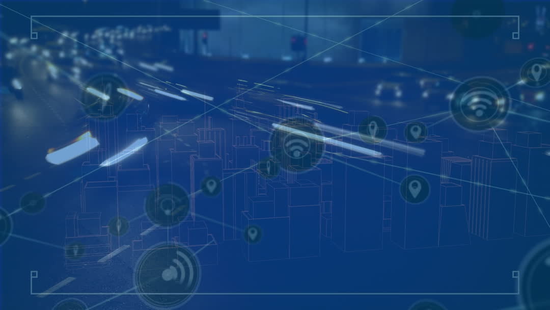 Muted city scene combines futuristic elements with schematic model showing digital icons over city traffic. Perfect for illustrating smart city concepts, global connectivity, and emerging technology in urban contexts. Suitable for use in presentations on smart urban development, digital transformation, or tech strategy visualizations.