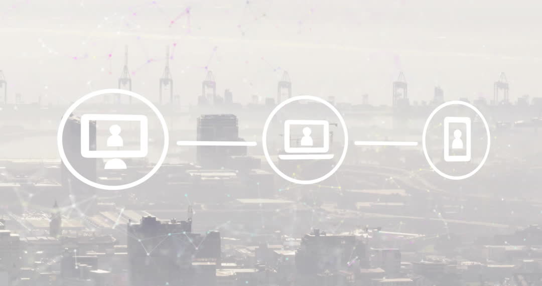 Conceptual representation of digital connectivity showcasing abstract icons of communication devices like computers and smartphones connected over an urban landscape. Suitable for use in presentations related to digital transformation, smart city planning, communication networks, and modern technology solutions.