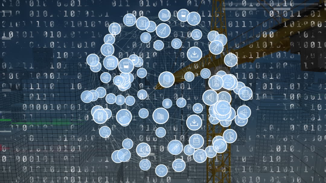 Digital representation of network integration over a blurry cityscape suggests modern technology and connectivity. Various icons connected by lines imply communication and data processing on a global level. Useful for illustrating concepts in technology advancement, telecommunications, or future urban planning.