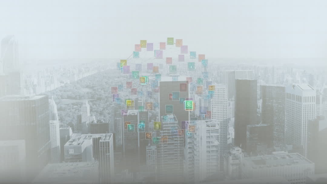 This visual portrays the integration of a digital network interface over an urban cityscape, exemplifying the harmony between technology and metropolitan lifestyle. This concept can be effectively utilized in scenarios discussing future urban development, smart cities, and the role of digital innovation in modern infrastructure.