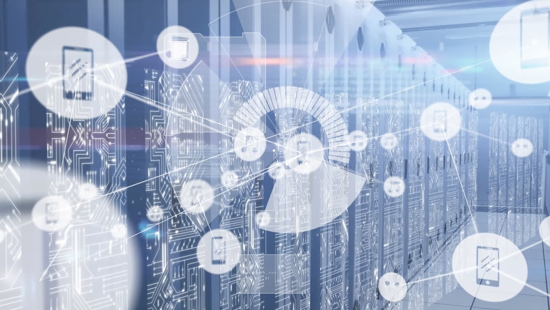 Futuristic graphics show interconnected icons over server towers, representing digital connections and technology. Useful for illustrating concepts of digital networks, data handling, and modern computing systems in business and technology presentations or marketing materials.