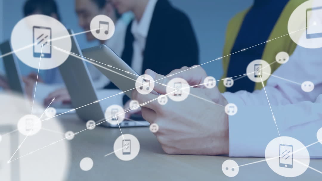 Image shows multiple business executives using devices connected via digital interface icons like music and smartphones. This depicts modern technology's impact on workplace collaboration and networking. Suitable for content on digital transformation, teamwork, business technology solutions, and global connectivity in businesses.