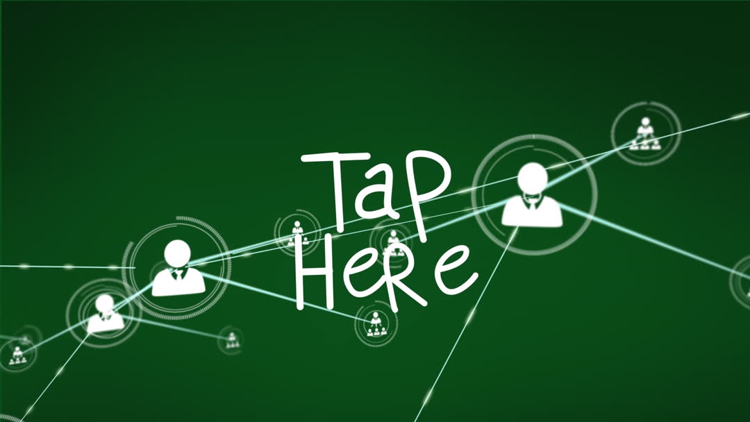 Illustrating digital network with interconnected icons and call-to-action text 'Tap Here' on green backdrop. Useful for concepts of communication, technology displays, online interactions whereabouts and digital interfaces. Ideal engages various design for promotional media related social networking or technology presentations.