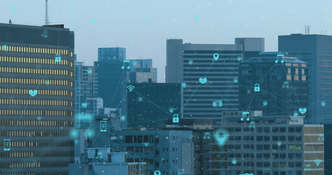 Visual representation of technology linking buildings in a city, illustrating modern tech connected through digital networks. Useful for presentations about smart cities, IoT solutions, or technological integration.