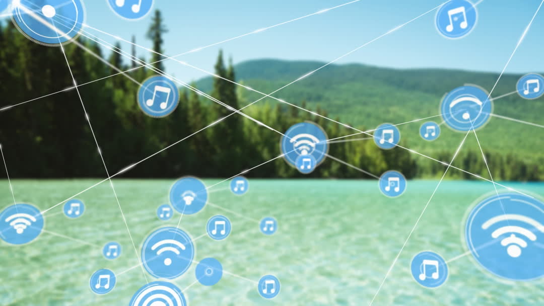 Music icons connected by digital network overlay scenic view of a pristine lake with a forested background. Perfect visualization of the blend of technology with nature. Ideal for use in presentations regarding network communication, wireless innovation, or technological advancements linked with nature themes.
