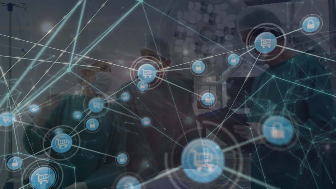 This futuristic scenario features interconnected digital networks in a healthcare environment, symbolizing technological advancements and innovations. The overlay of digital symbols and security icons suggests cybersecurity and smart healthcare solutions. Useful for content related to technology, medicine, healthcare innovations, and IT solutions in medical fields, enhancing visual presentations and online content.