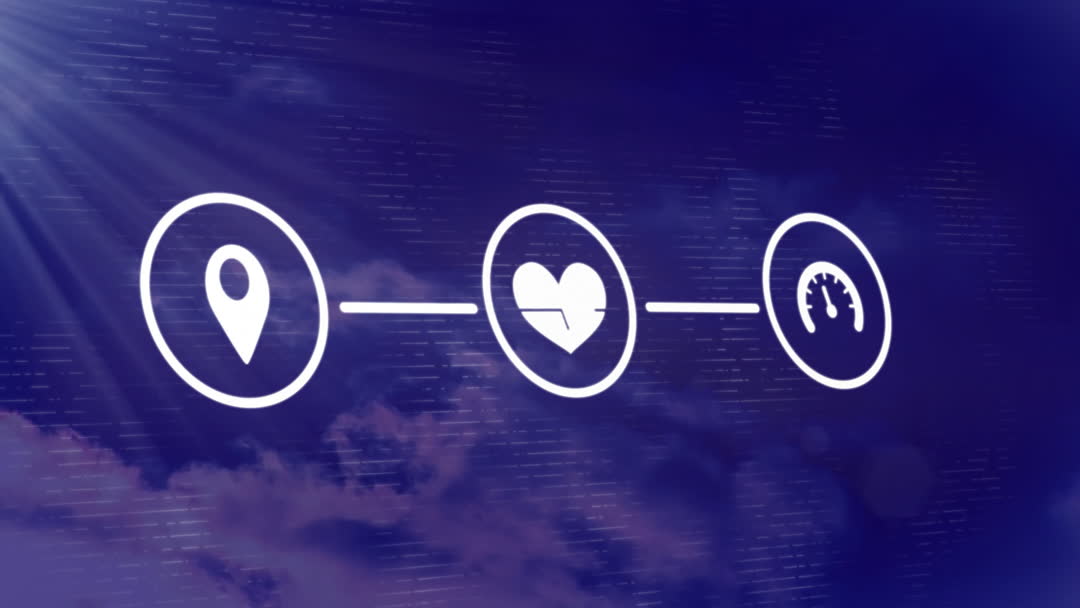 Visual representation of digital networking through a series of connected icons including location, heart, and speedometer depicting dynamic data interaction. Useful for themes involving technology integration, communication strategies, and data visualization in business presentations or design content.