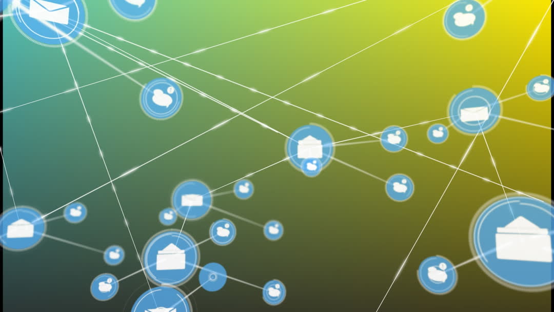This digital composition features interconnected icons representations such as emails and duck set against a gradient backdrop. Ideal for illustrating global connectivity, the vast web of technology and corporate communication, suitable for business technology presentations, IT service advertisements, or articles focusing on innovation and globalization within tech industries.