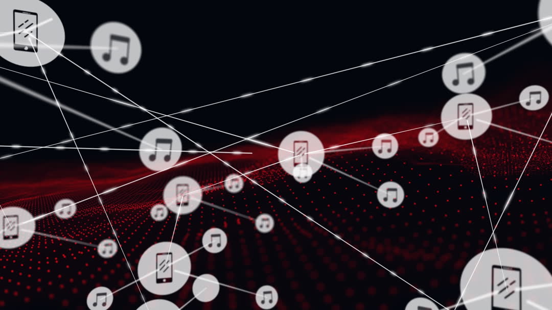 Conceptual representation of digital networking in music industry. Useful for online articles, presentations, and digital technology contexts.
