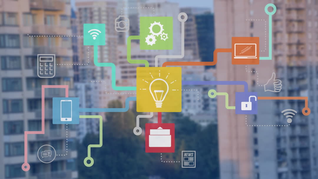 Visualization of digital connections with technology icons overlaying an urban cityscape, representing smart city concepts and networks. Suitable for use in presentations on innovation, IoT applications, urban technology development, or articles related to city infrastructure modernization.