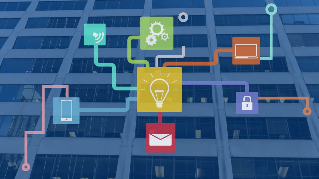 Colorful network of technology icons shown against a backdrop of an office building, illustrating themes of global communication and digital connectivity. Icons include a light bulb, laptop, gears, lock, and smartphone perpetuating a sense of innovation and advanced technology. Ideal for use in presentations on digital advancements, online security, technology integration, communication, and business strategies.
