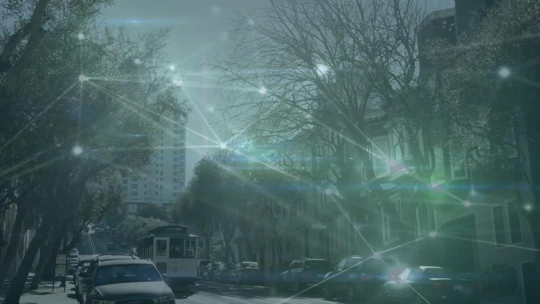 - Digital Network Over Cityscape with Sunlight Filtering Through Trees