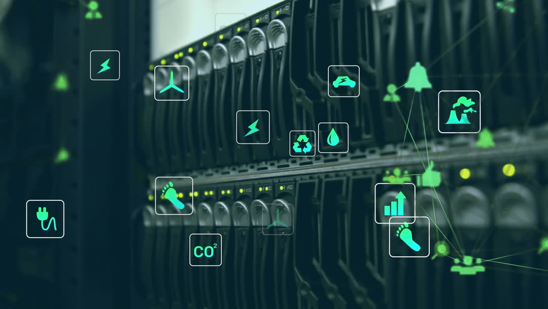 Digital icons hovering over computer servers illustrate advanced data storage and network technology, emphasizing connectivity in global business environments. This visual is ideal for representing concepts of digital transformation, cloud computing, and energy management in technological industries. Suitable for marketing materials for tech companies or educational content on data systems.