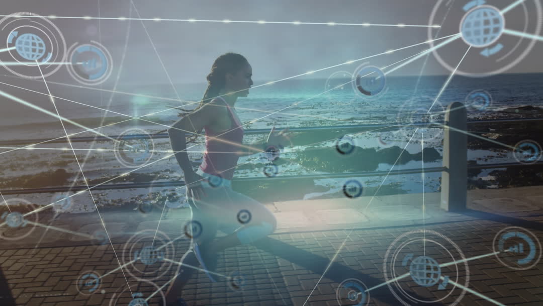 Energy and technology concept depicted by digital connections overlaying an video of a woman running along a promenade by the beach. Ideal for articles on health-tech integration, athletic digital interfaces, fitness strategies in the modern world, or design projects highlighting innovation.