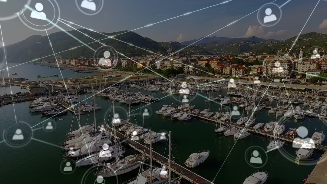Image shows digital network overlay using translucent lines and user icons interconnecting above a marina with multiple yachts docked. A vibrant city stretches in the background against a mountainous landscape. This video signifies modern connectivity, ideal for representing concepts related to global communication, technology implementation, and smart city planning. Perfect for marketing technology solutions or illustrating connectivity trends in urban developments.