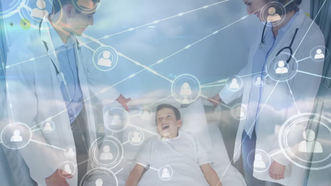 Doctors leaning over young patient, showcasing combination of technology and modern medicine through digital network overlay. Represents advanced pediatric care, roles of healthcare professions, and telemedical innovations. Useful for topics related to medical technology, teamwork in clinical settings, and healthcare advancements.