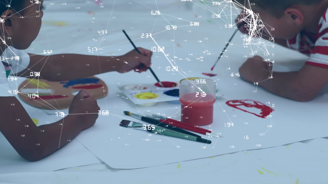 Children creatively painting together while digital network overlay highlights global connectivity concepts. Represents modern education merging technology, creativity, and collaborative learning. Useful for illustrating themes around future education, innovative learning strategies, or tech-enhanced creativity environment.