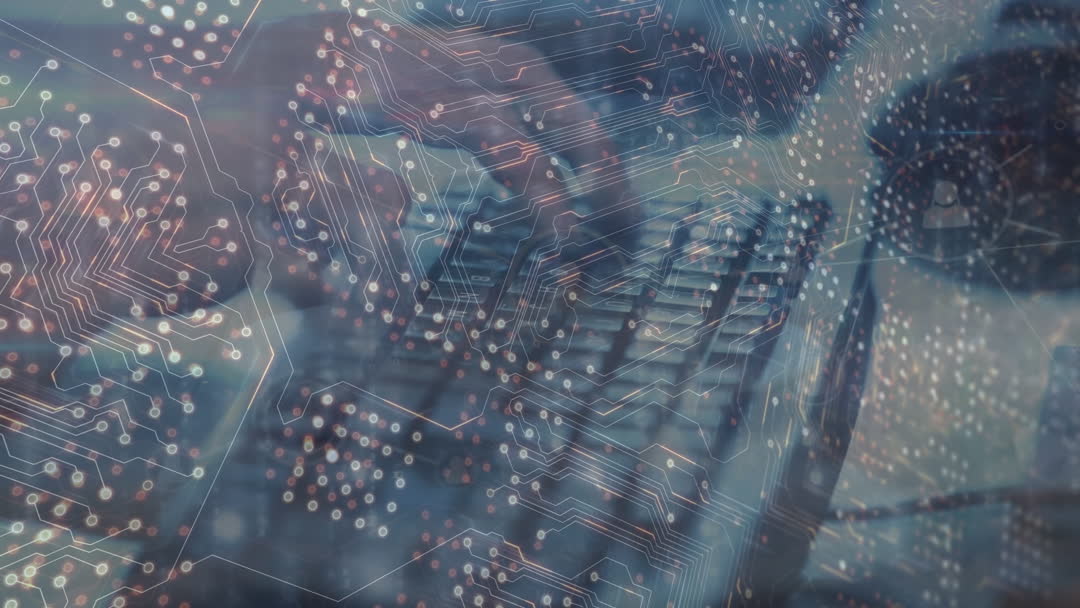 Digital Network Overlay on Circuit Board and Typing Hands Video